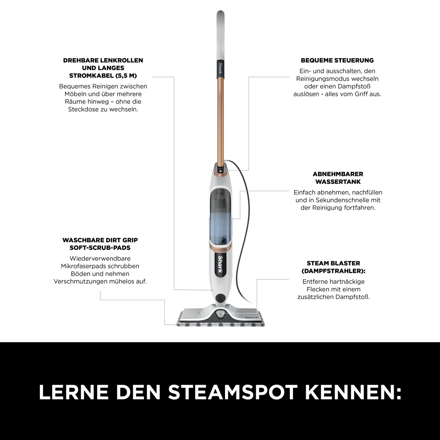 Der neue Shark SteamSpot mit SteamBlaster-Technologie.Beseitigt hartnäckige Verschmutzungen allein mit Wasser, mit einem gezielten Dampfstrahl – direkt auf Knopfdruck.