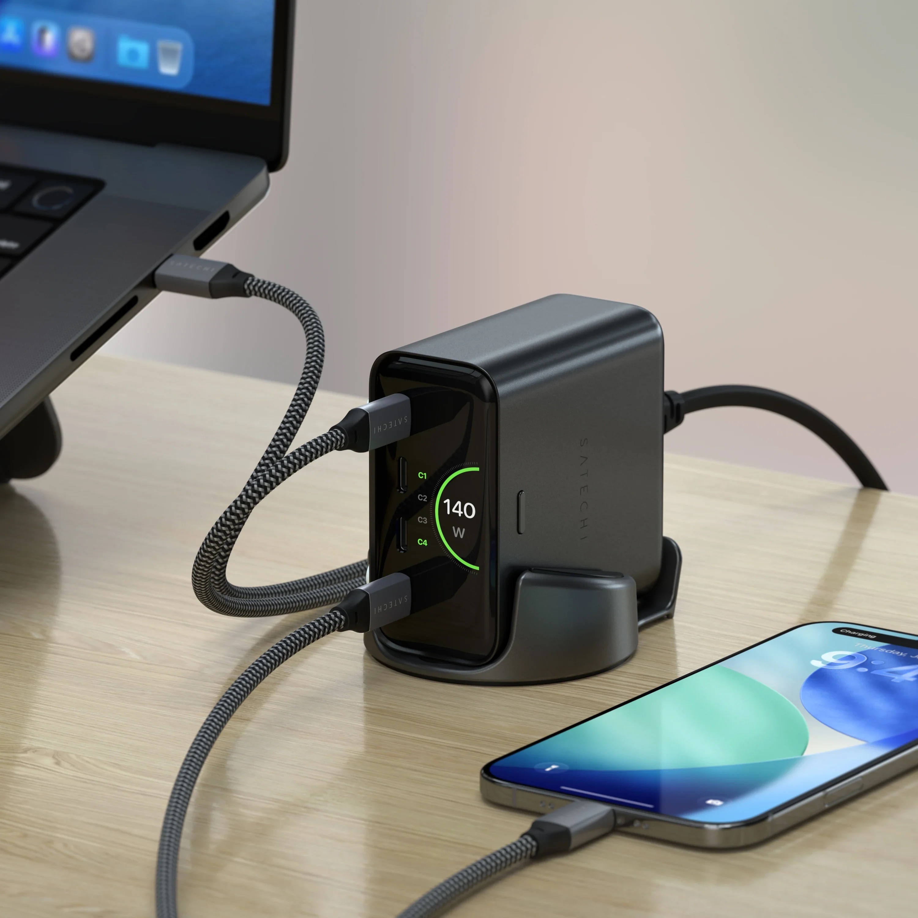 Kompaktes GaN Ladegerät mit 140W und 4x USB-C PD Ports mit PPS Technologie und Stromverbrauchsanzeige inkl. Halterung - Schwarz