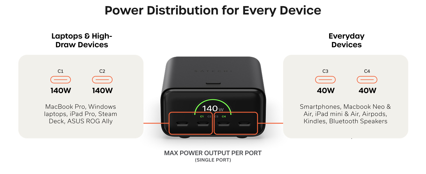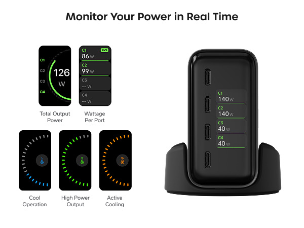 Die Gesamtleistung von 140 W liefert schnelle und zuverlässige Stromversorgung für Laptops, Tablets, Smartphones und Zubehör. Die digitale Live-Anzeige pro Anschluss zeigt die Stromverteilung auf alle angeschlossenen USB-C-Geräte in Echtzeit an. Die fortschrittliche GaN-Ladetechnologie bietet effiziente Leistung mit hoher Ausgangsleistung in einem kompakten und schreibtischfreundlichen Design. Vier USB-C-Anschlüsse mit PPS sorgen für optimiertes Laden jedes Geräts, wobei USB PD 3.2 AVS an C1 das schnellstmögliche Laden der neuesten iPhones ermöglicht.Technische Daten