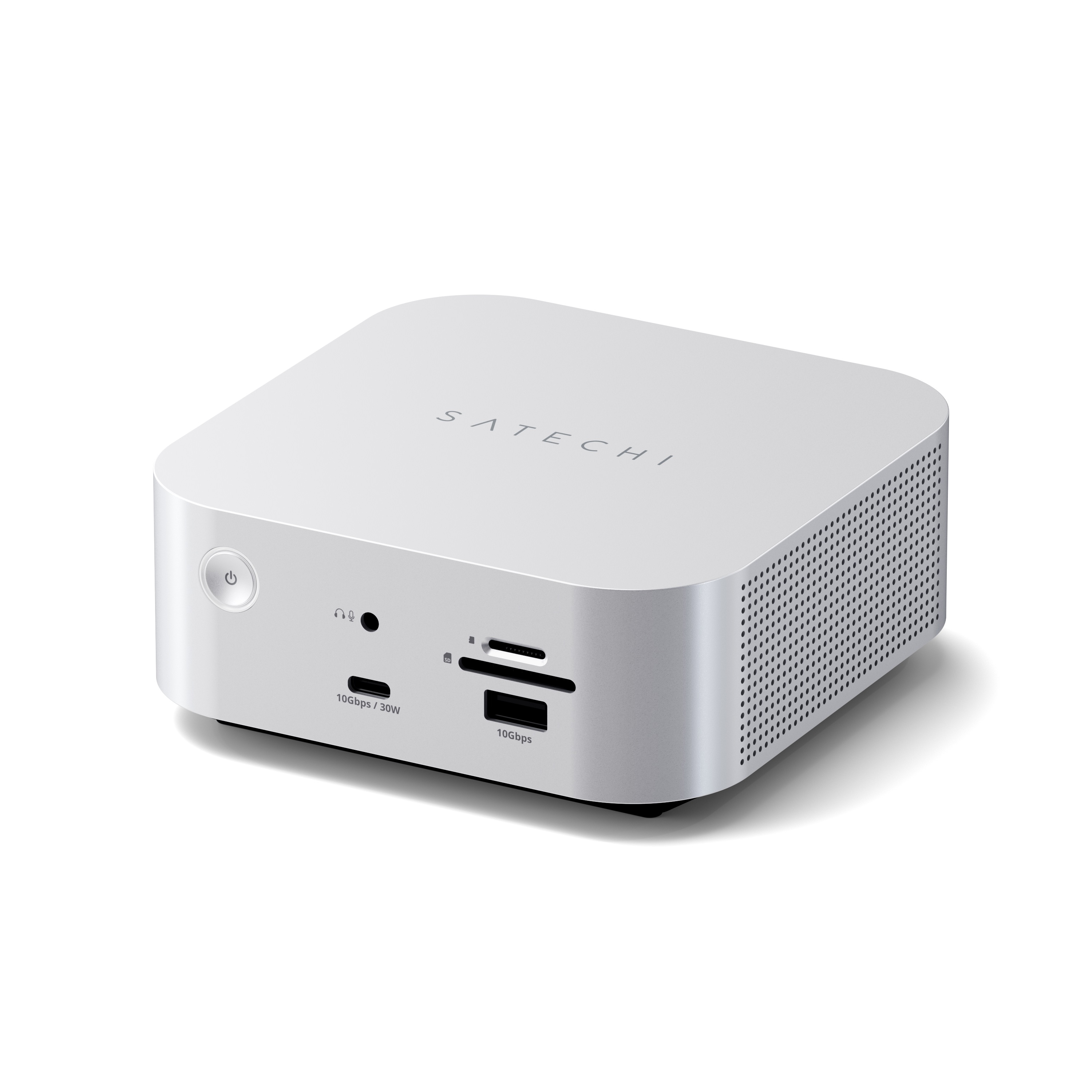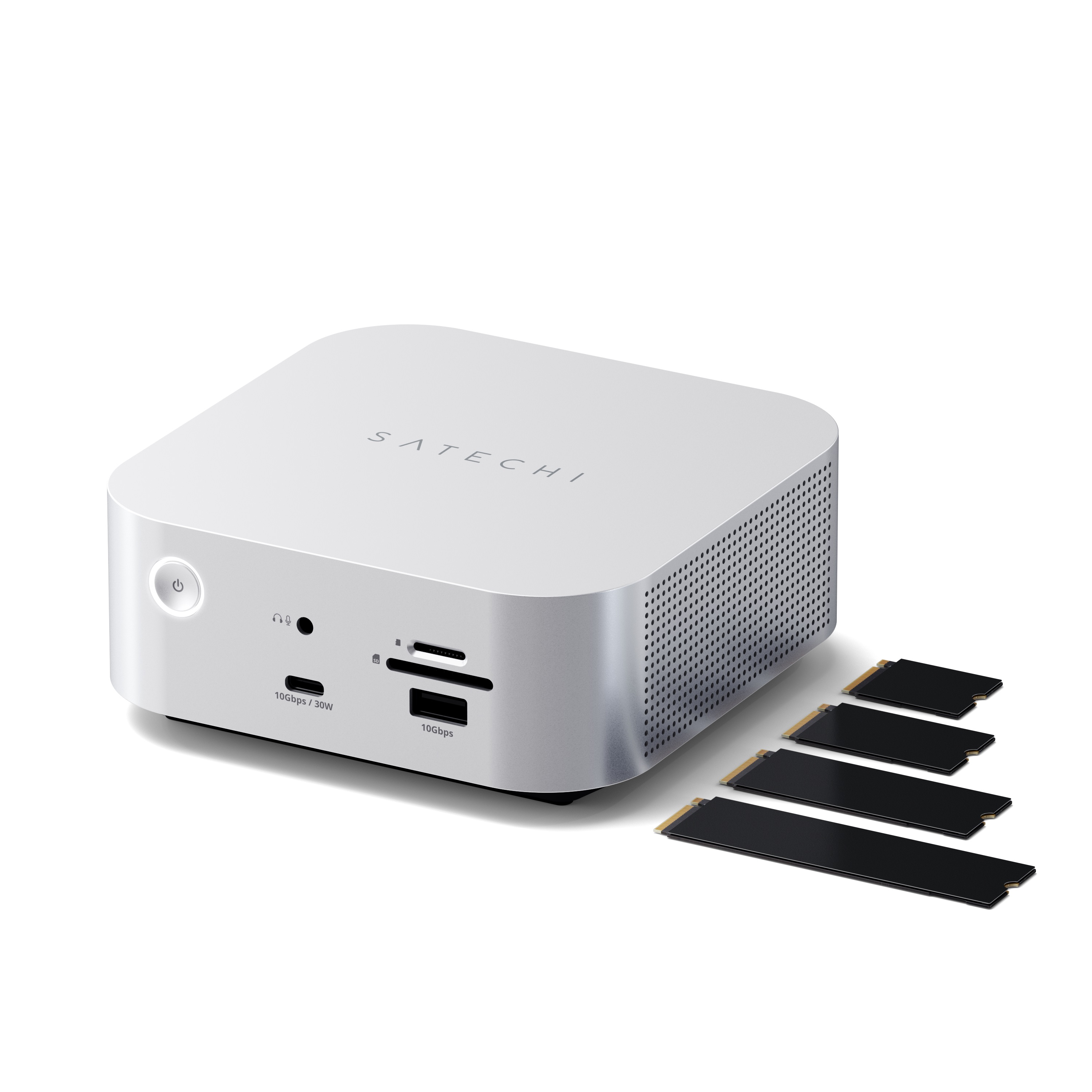 Satechi Mac Mini M4 Alu Stand & Hub m. NVME SSD - Hochwertiger und eleganter Untersatz für Mac Mini M4 mit 3x USB-A Ports, SD-Slot und Power On Aussparung inkl. Fach für NVMe M.2 2230/2242/2260/2280 SSD - Alu