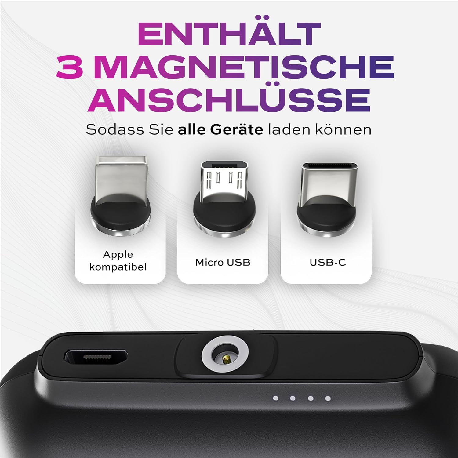 Kompakte magnetische Powerbank mit 3'200 mAh, ideal für Smartphones, Tablets, Kopfhörer und mehr mit magnetischen USB-C, Lightning & Micro-USB Stecker - Schwarz