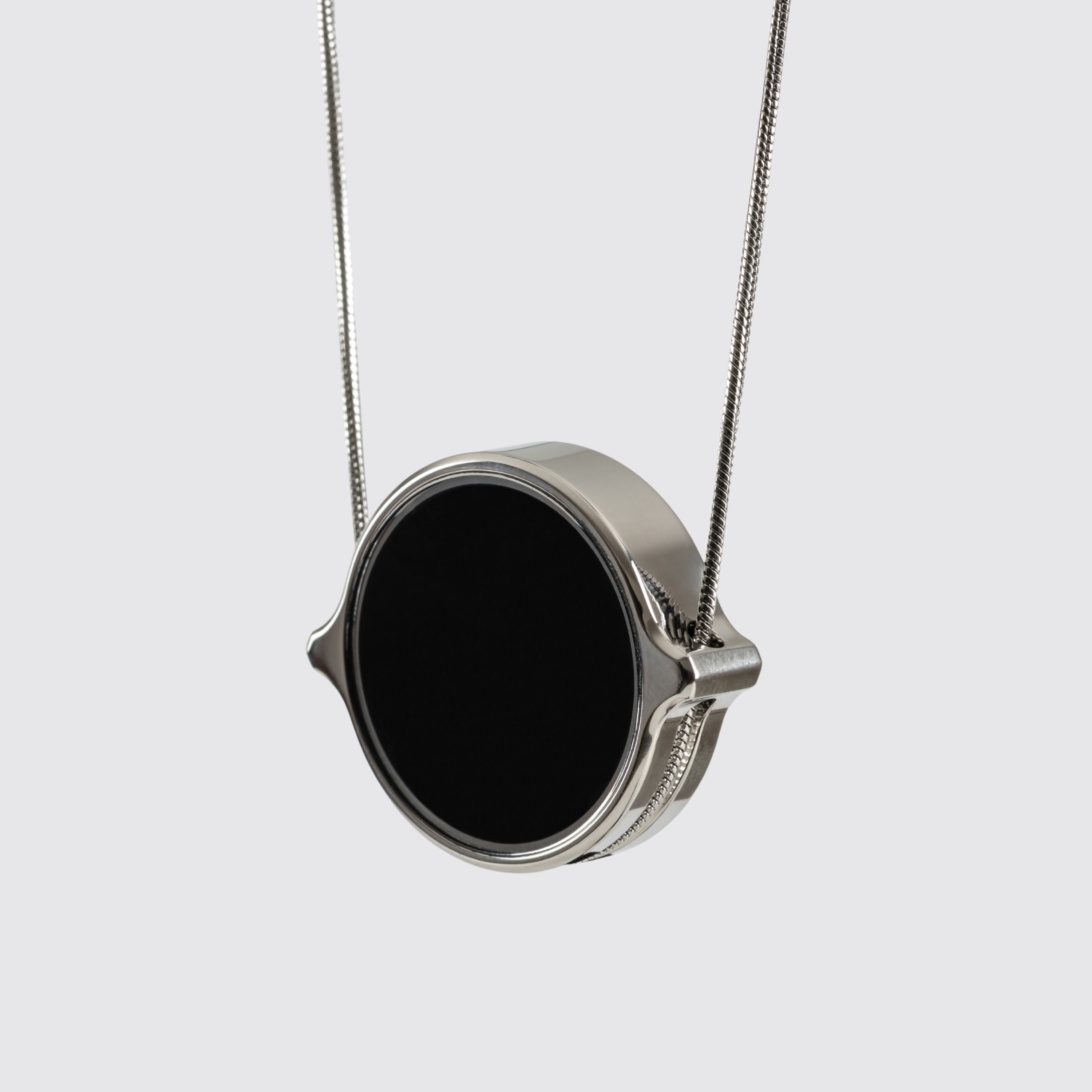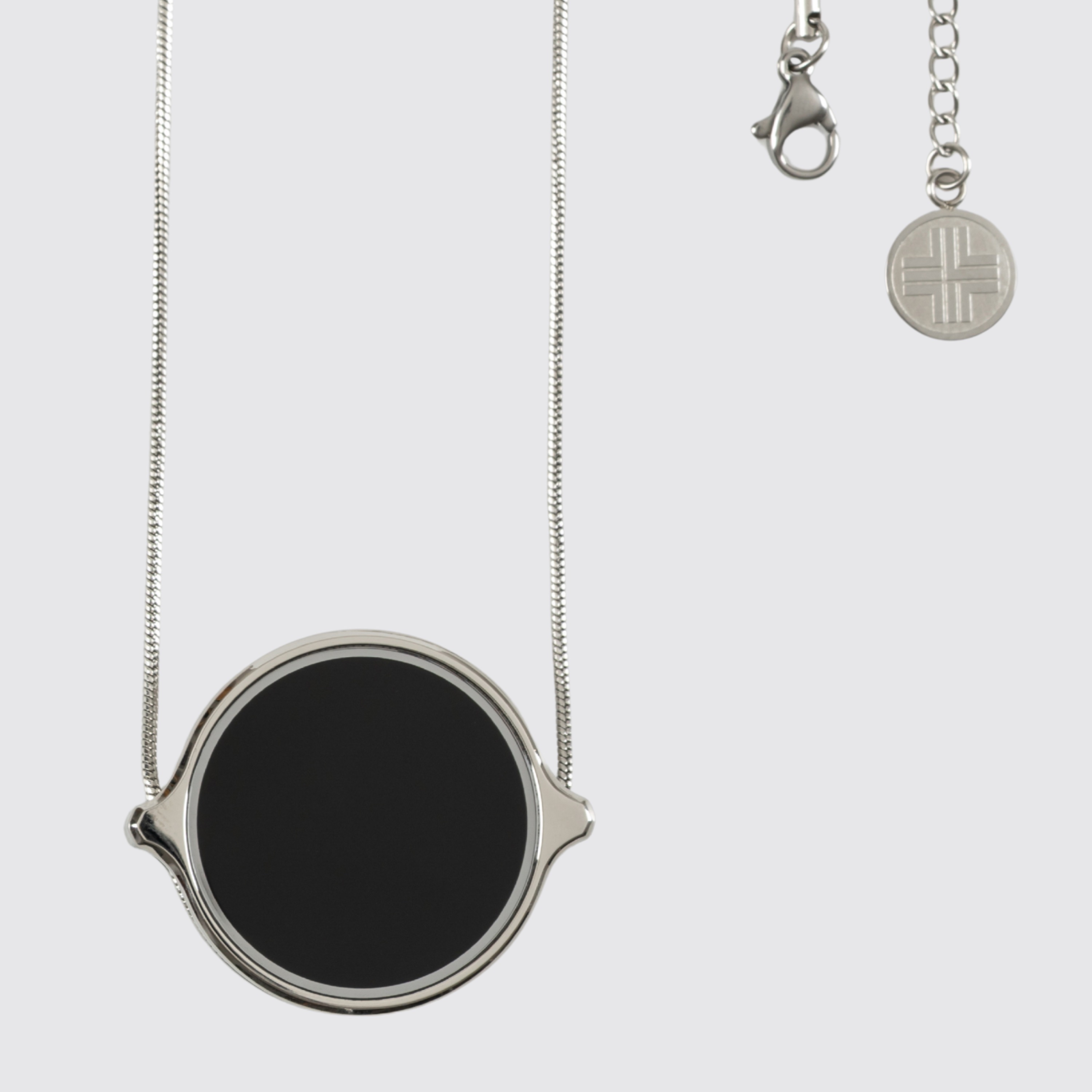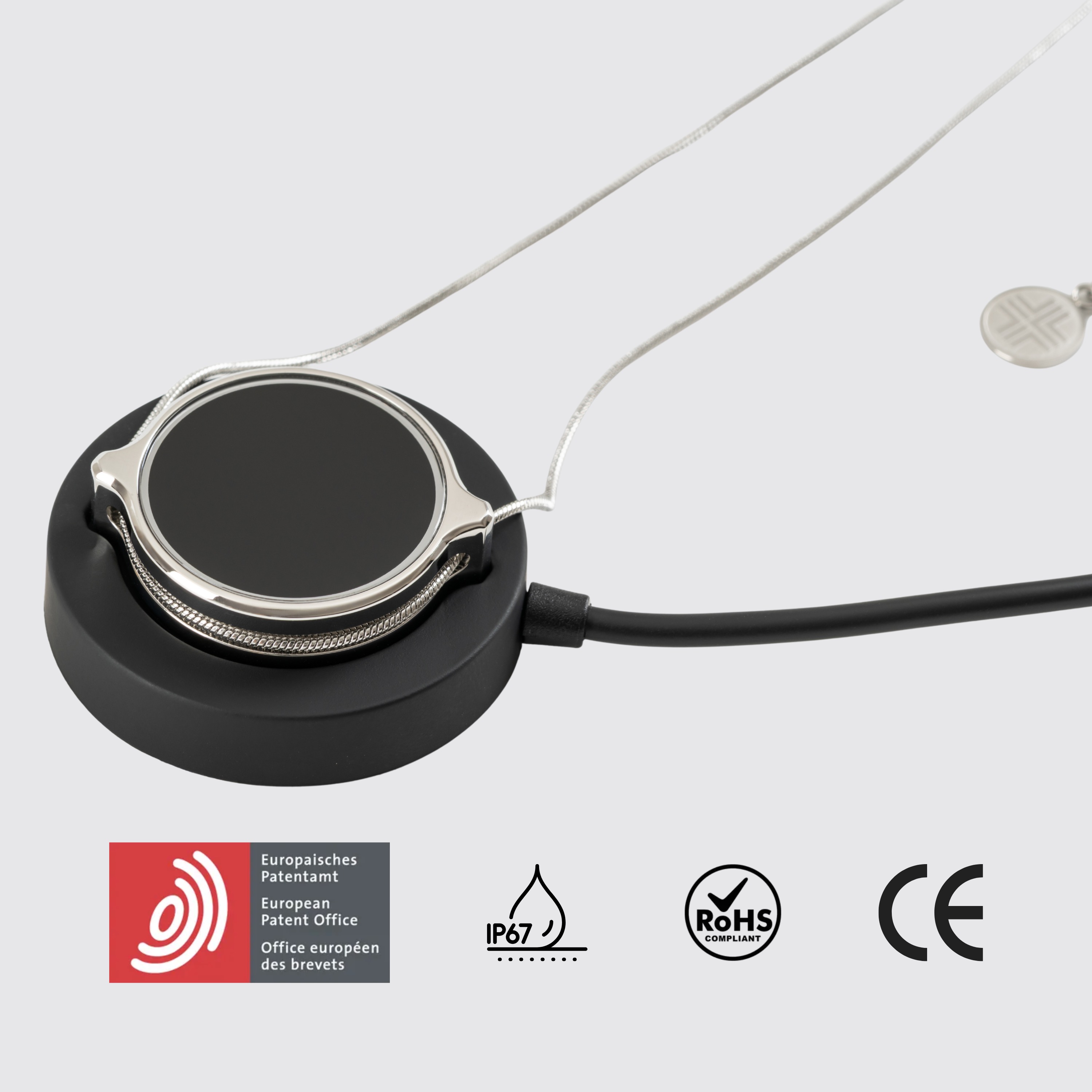 Die Kette liegt im Bereich der Thymusregion auf und wurde so entwickelt, dass Form, Gewicht und Vibration ein spürbares, aber unaufdringliches Erlebnis ermöglichen.