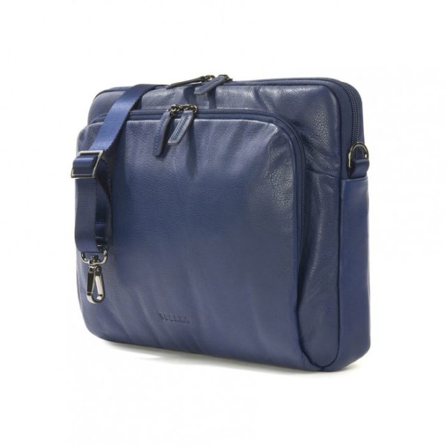 Edles Sleeve aus weichem Vollrindleder in hochwertiger Verarbeitung. Die Tasche läßt sich als Sleeve oder Umhängetasche tragen. Der gepolsterte Gurt ist abnehm- und in der Länge verstellbar. Das Hauptfach ist mit dem speziellen Anti-Slip-System von Tucano ausgestattet und bietet Platz für ein MacBook Pro/Air 13" sowie Zeitschriften oder Bücher. Auf der Vorderseite befindet sich ein zusätzliches Reißverschlußfach, das sich bequem weit und sicher öffnen lässt. Darin finden neben einem Tablet oder iPad ebenfalls Accessoires wie Karten und Stifte in übersichtlichen Steckfächern Platz.