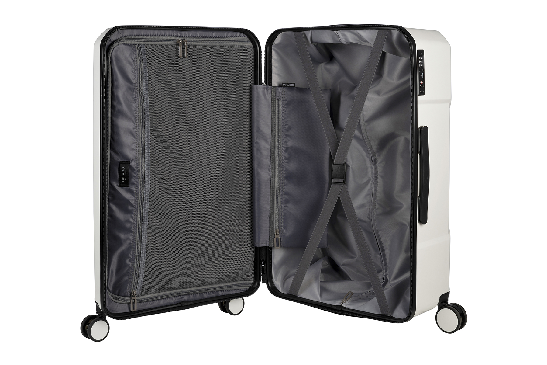 Das geräumige Innenfach ist durch eine praktische Stofftrennwand mit Reißverschluss unterteilt, die für Organisation und Ordnung sorgt. Großzügige Taschen ermöglichen die geschickte Aufbewahrung von Gegenständen unterschiedlicher Größen, während der doppelte Riemen sicherstellt, dass Ihre Kleidung während der Reise faltenfrei bleibt.