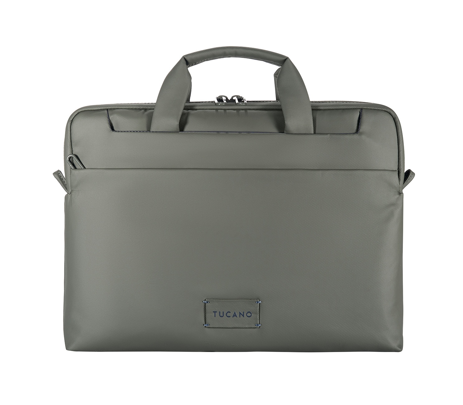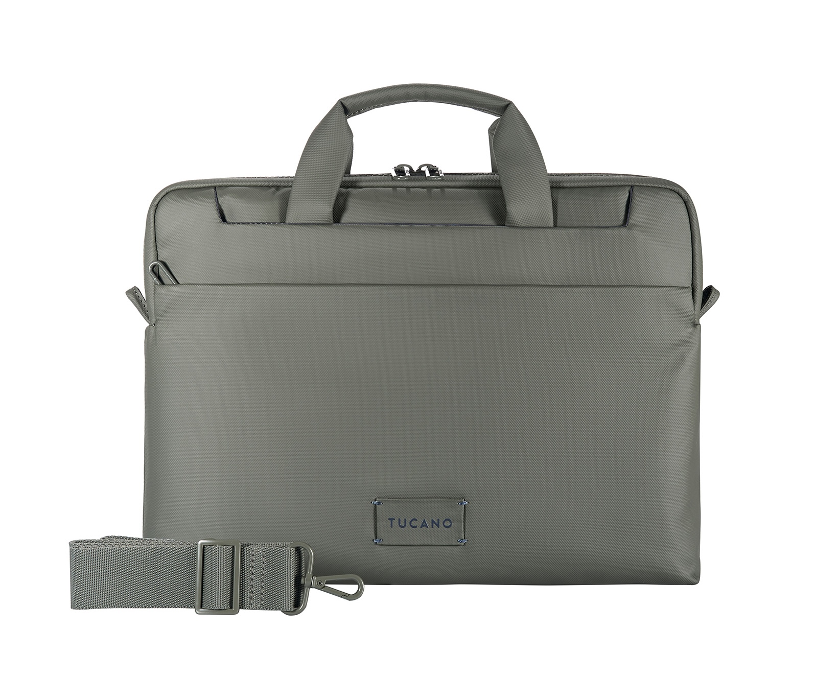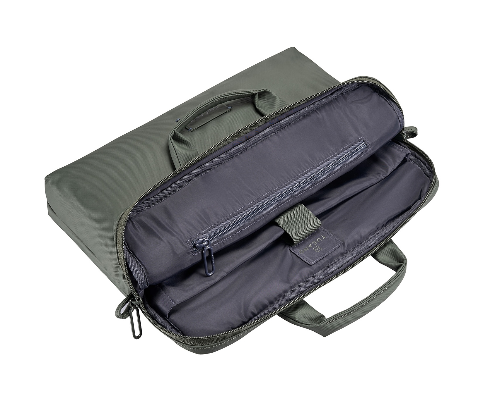 Kompakte Laptoptasche aus beschichtetem, recyceltem Material mit gepolstertem Laptopfach, durchdachter Innenorganisation und abnehmbarem Schultergurt für alle MacBooks bis 14" und Laptops bis 13" - Green