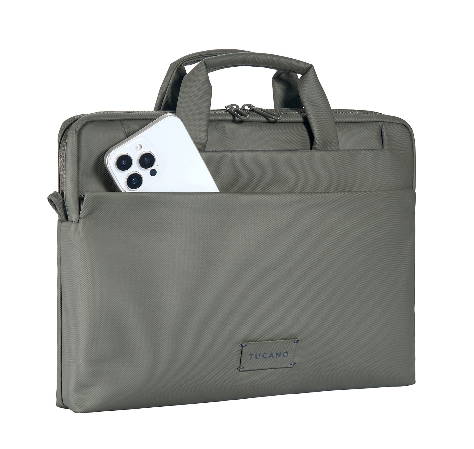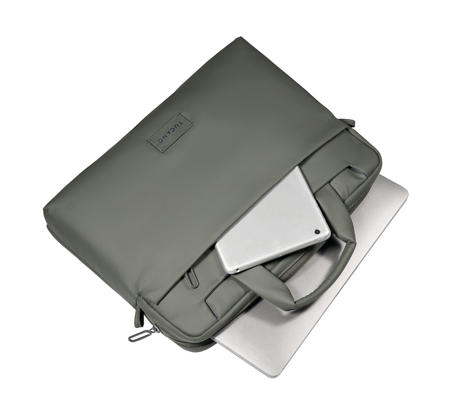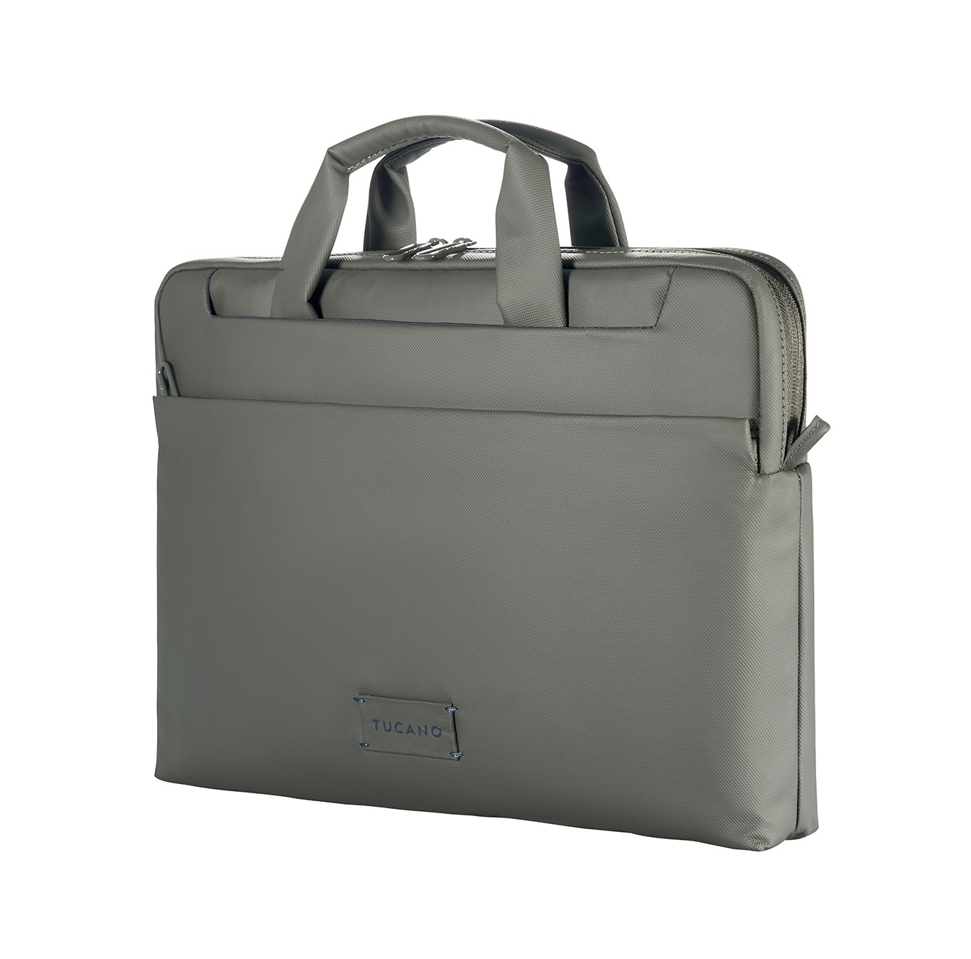 Kompakte Laptoptasche aus beschichtetem, recyceltem Material mit gepolstertem Laptopfach, durchdachter Innenorganisation und abnehmbarem Schultergurt für alle MacBooks bis 14" und Laptops bis 13" - Green