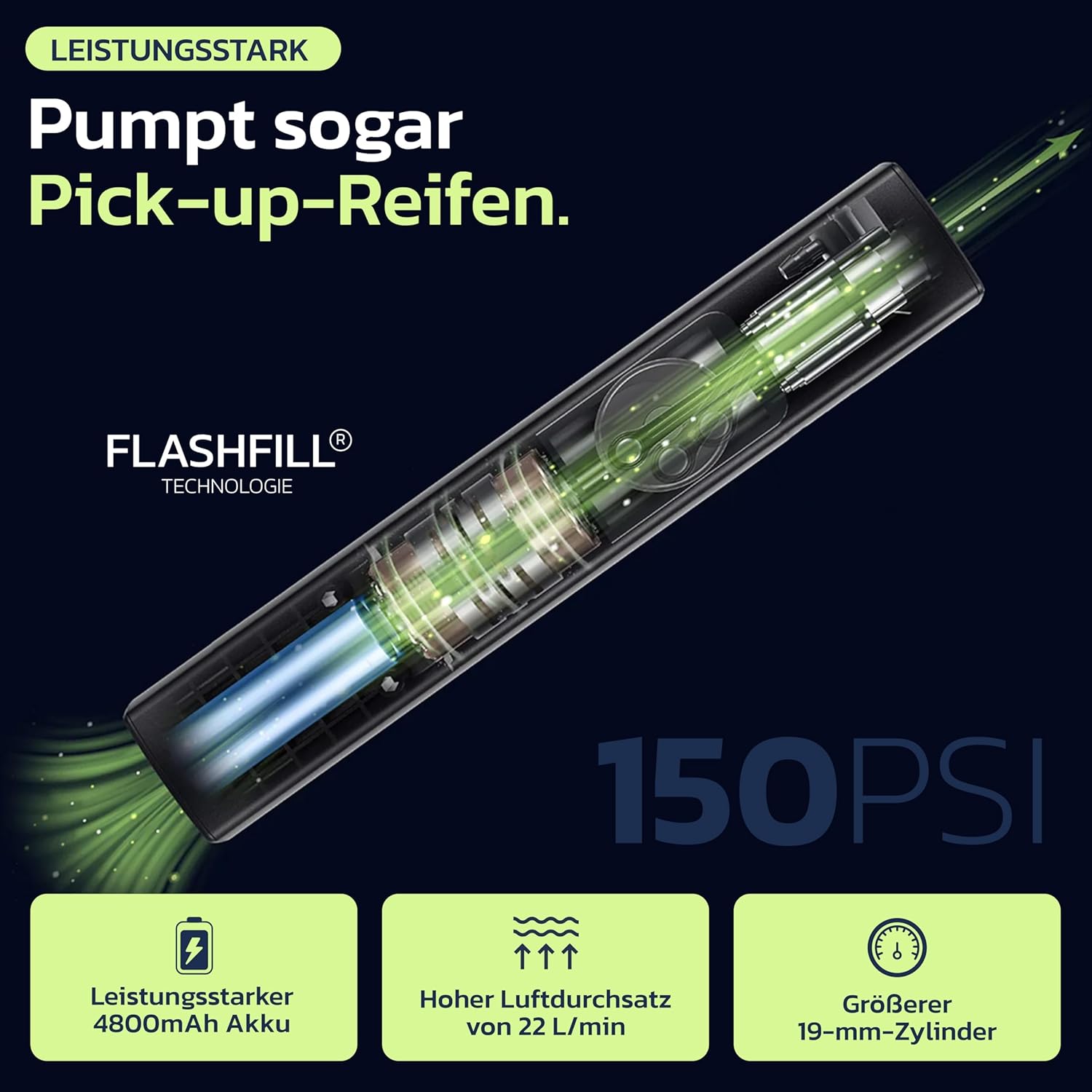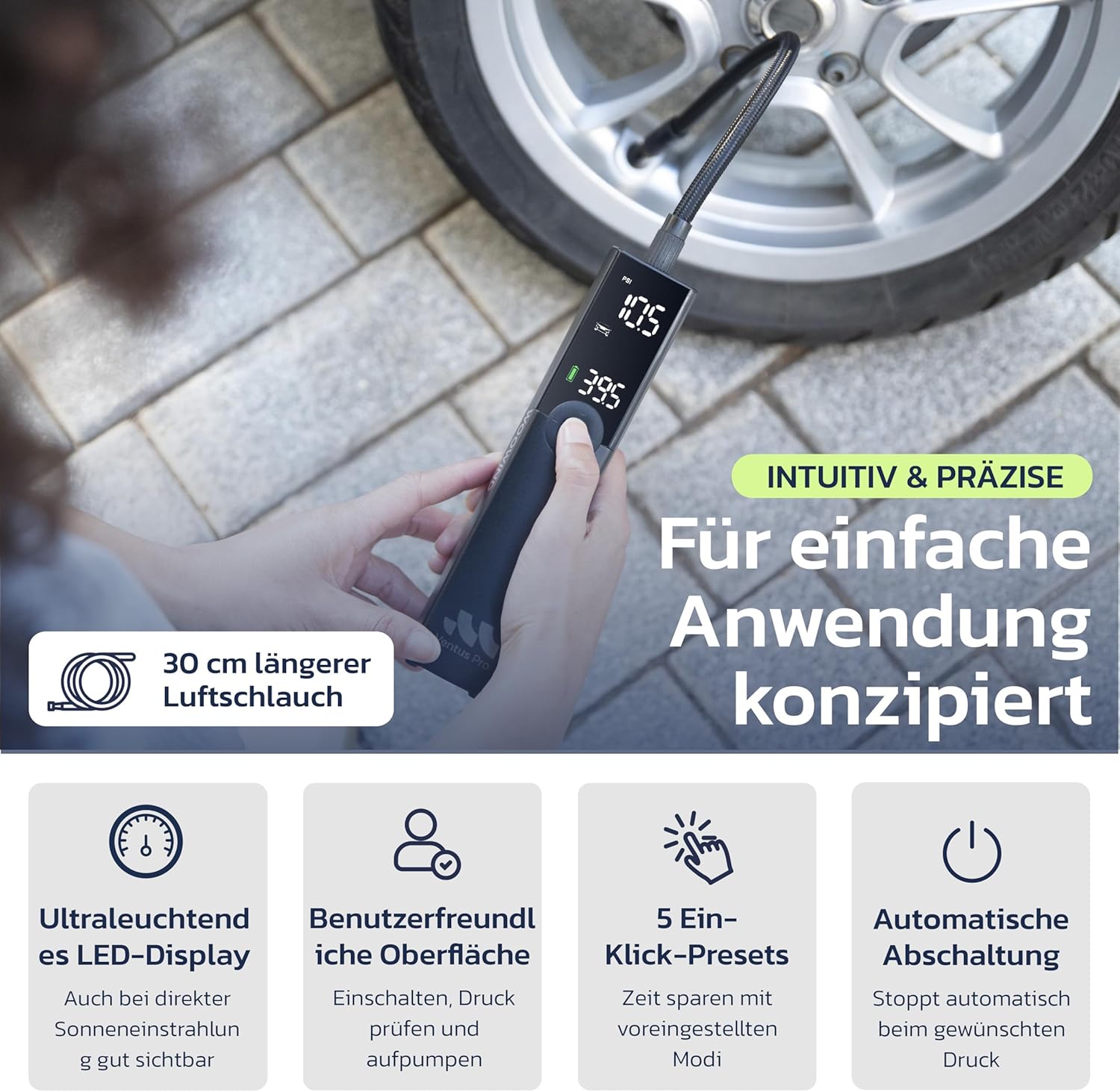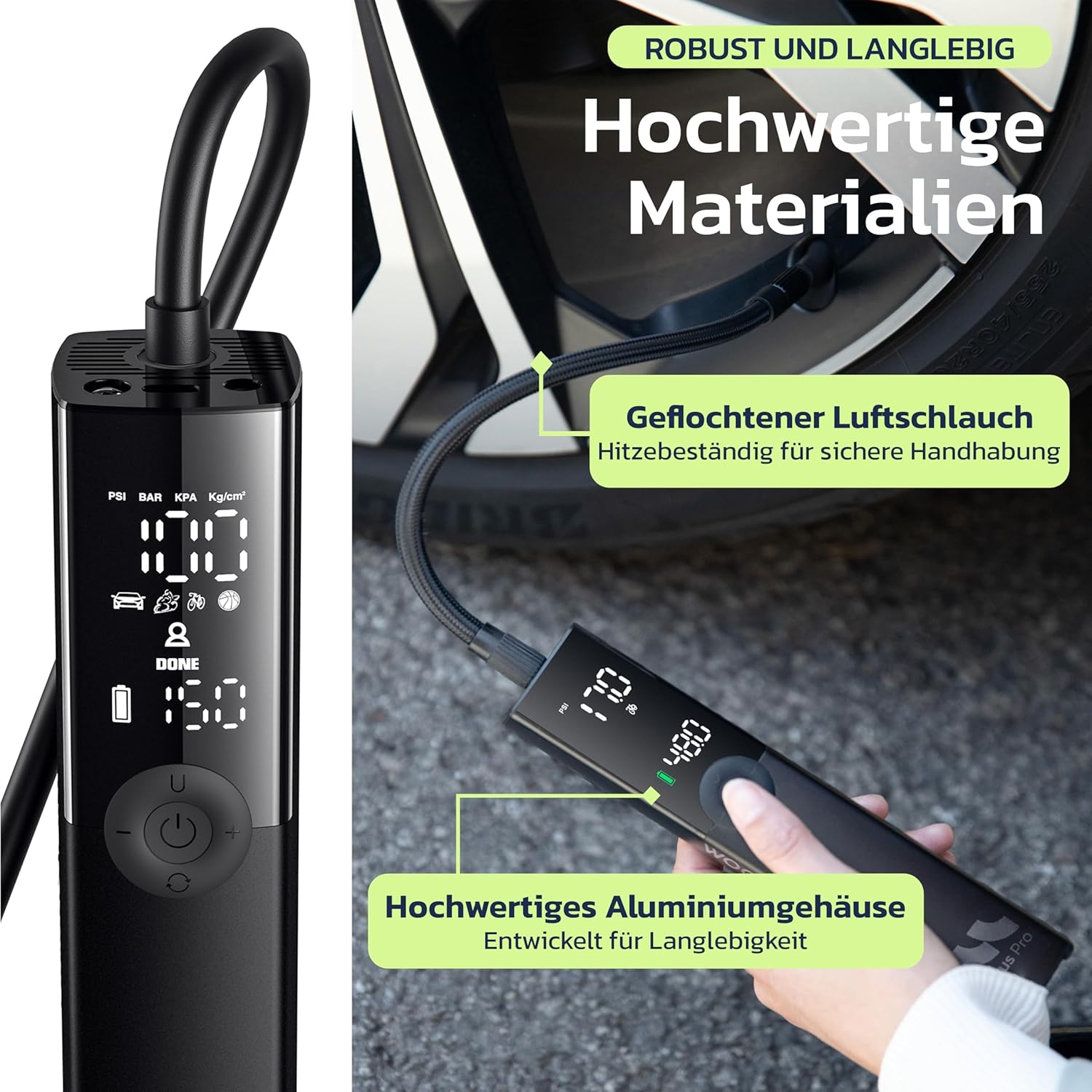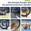 - 5 Preset-Modi: Auto (26–50 PSI) / Motorrad (26–43 PSI) / Fahrrad (30–145 PSI) / Ball (4–16 PSI) / Benutzerdefiniert (1–150 PSI)