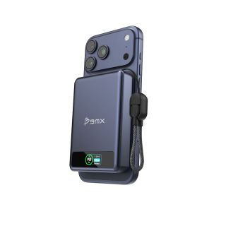 BMX SolidSafe 10K - Kompakte 10'000mAh Semi-Solid State MagSafe Power Bank mit 20 Watt Leistung, Full Color LCD Bildschirm, MagSafe sowie Qi2 Wireless Charging Funktion inkl. USB-C Kabel als Anhänger - Blue